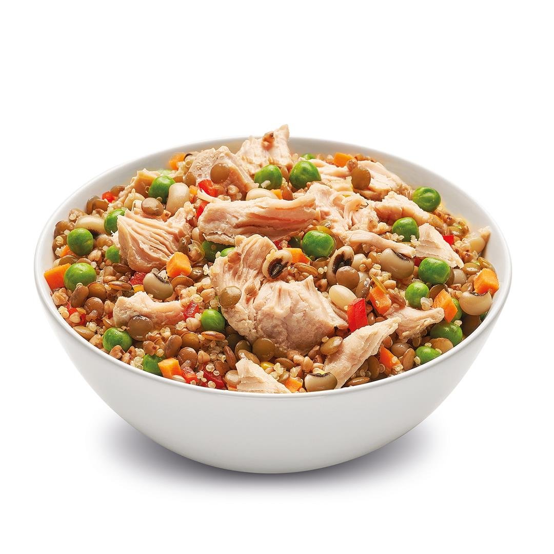 İçindekiler: Hindi göğüs eti (%42), tahıl (%18) (karabuğday), börülce, yeşil mercimek, maş fasulyesi, bezelye, havuç, tohum (%5) (kinoa tohumu, keten tohumu, chia tohumu), kapya biber, kurutulmuş domates, natürel sızma zeytinyağı, su, tuz. Ürünlerimiz İslami Şartlara uygun olarak kesilmiş etlerden